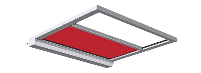 Die Horizontal-Verdunkelung ist ein horizontaler, innenliegender Sonnenschutz unter einer Lichtkuppel, die zugefahren einen Lichteintritt verhindert und den Raum verdunkelt. Statten sie elegant schlecht erreichbare Fenster aus.